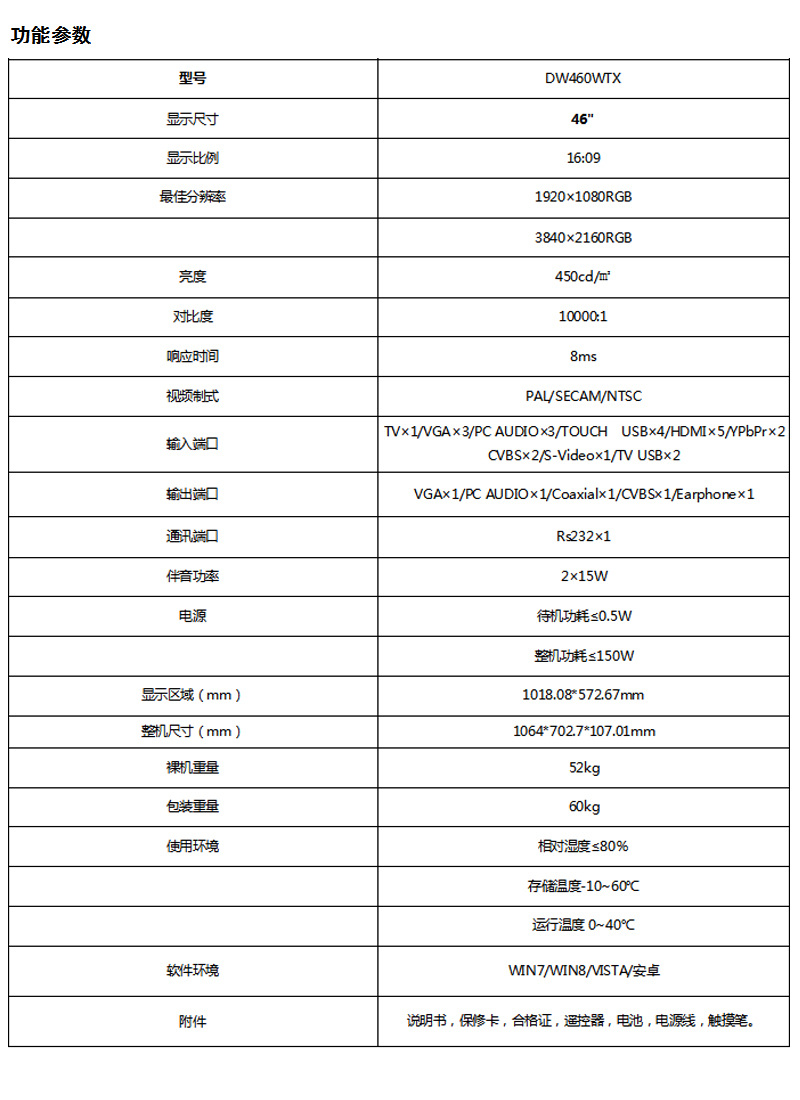 杭州七秀天媒帝触控教学一体机技术参数: