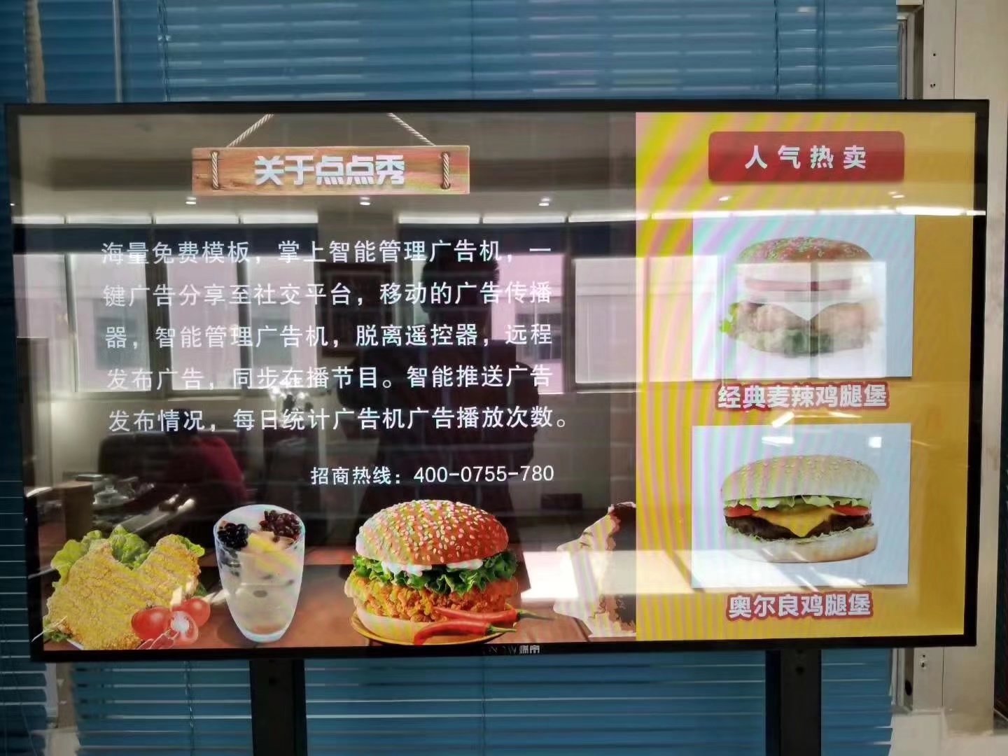 42寸超窄边广告机实物图搭载海量免费模板、掌上智能管理广告机,一键广告分享至社交平台,